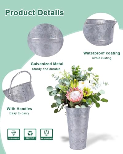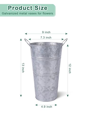 12 Inch Galvanized Metal Vases with Handles – 2 Pcs Farmhouse Decorative Metal Container for Flowers, Rustic Metal Bucket Planters for Wedding Decor (Silver)