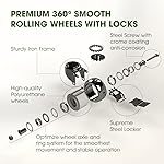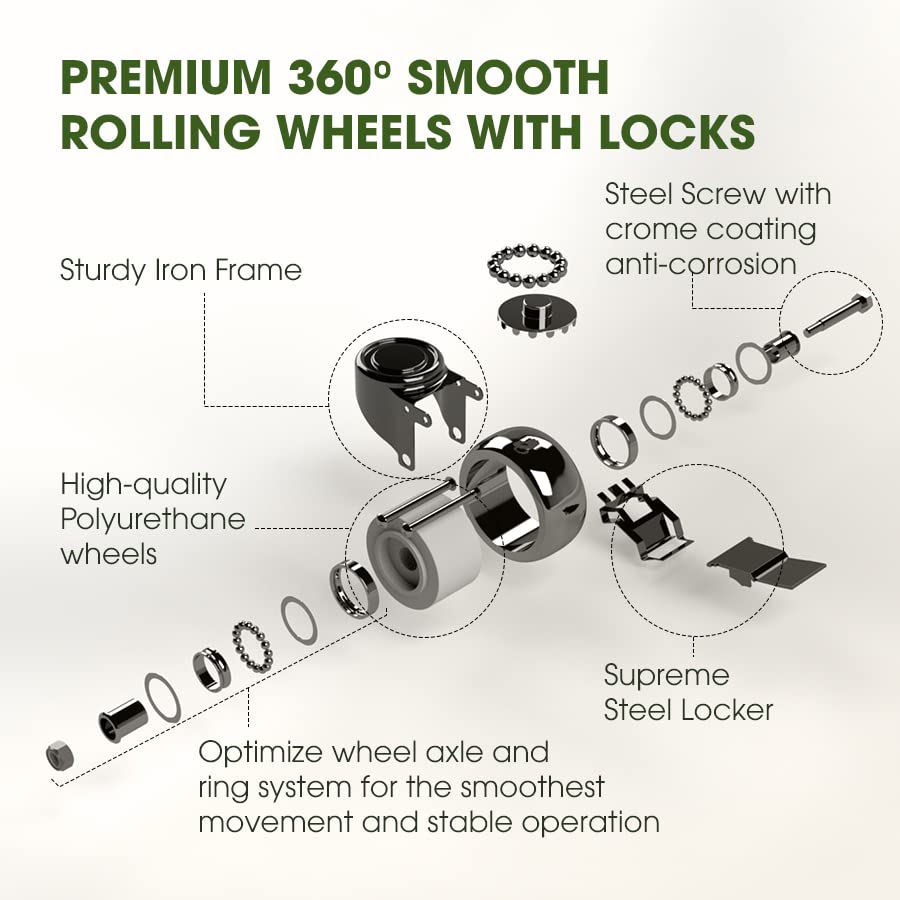 - PREMIUM 360 DEGREES SMOOTH ROLLING WHEELS WITH LOCKS: 360 degrees rotation Polyurethane wheels are resilient, flexible, and durable. Smoothly rolls on any surface such as carpet, soil ground, and lawn without being stuck or locked up. Locking wheels allow you to lock the caddy in place and prevent sliding.