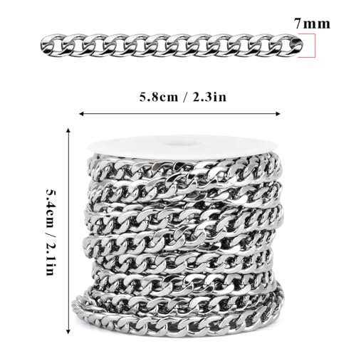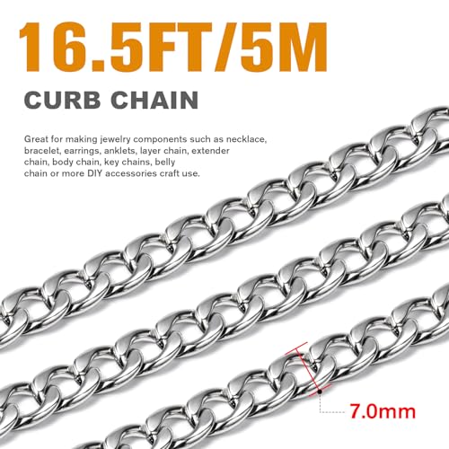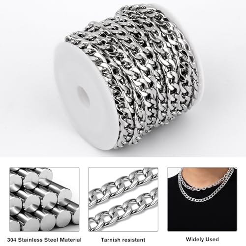 16.5 Ft Stainless Steel Curb Chains, 5mm 6mm 7mm 9mm Cuban Chain Roll Bulk for Jewelry Making