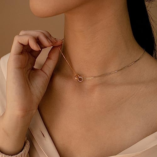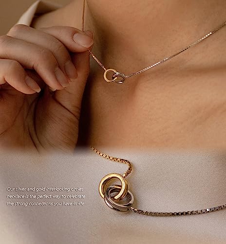 • Silver and gold interlocking circles necklace is the perfect way to celebrate the strong connections you have in life. Featuring mixed metal eternity circles pendant with an adjustable box Chain 16 inches to 18 inches. Every stylish woman should have a piece of linked two-circle necklace in their jewelry box.
