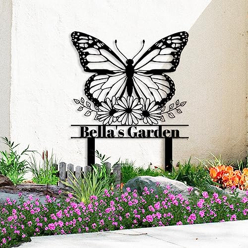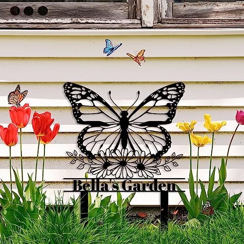 Personalized Garden Sign Garden Stake Metal Sign, Custom Flower Butterfly Garden Name Sign, Butterfly Yard Sign with Stakes Lawn Sign, Flower Sign Plaque Garden Decor Sign